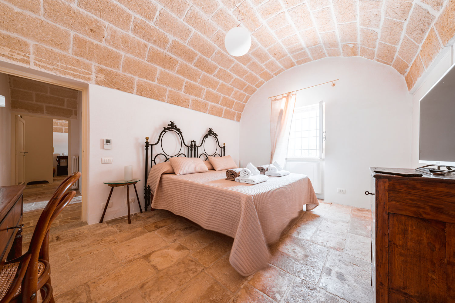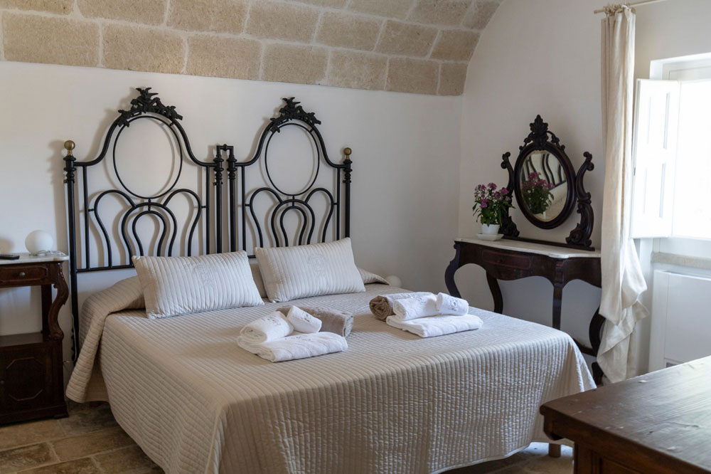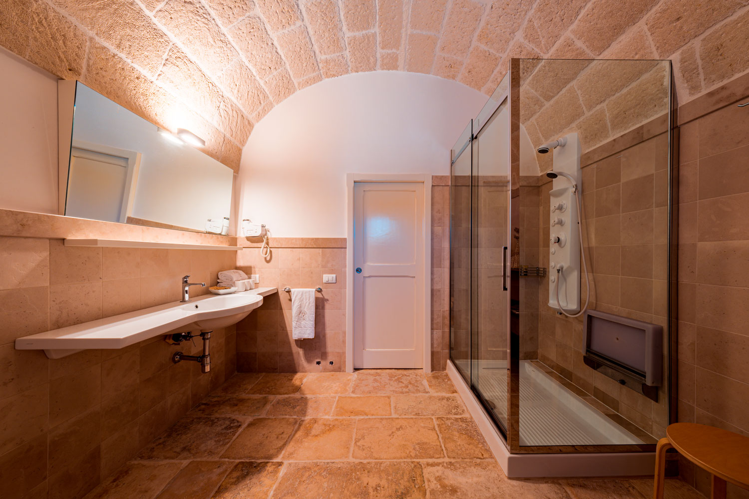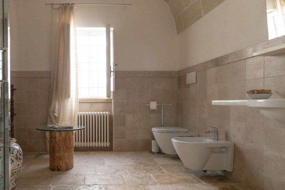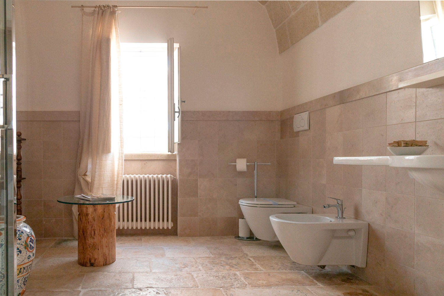 Gli ambienti, arredati nel puro stile della masseria pugliese, utilizzano materiali naturali, tonalità morbide e dettagli artigianali che raccontano la tradizione locale, creando un’atmosfera calda, accogliente e autentica. Le due stanze condividono un ampio bagno comune, luminoso e funzionale, progettato per garantire praticità e benessere durante tutto il soggiorno.