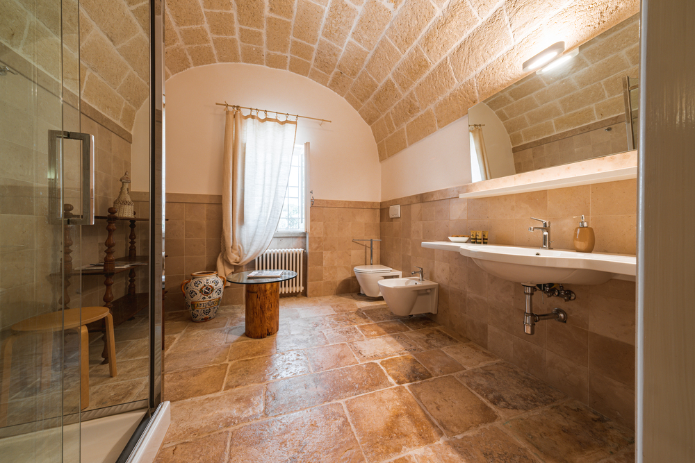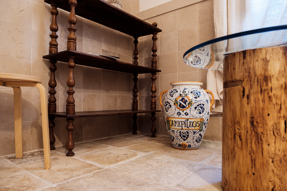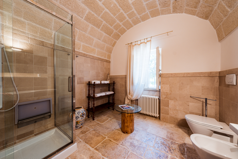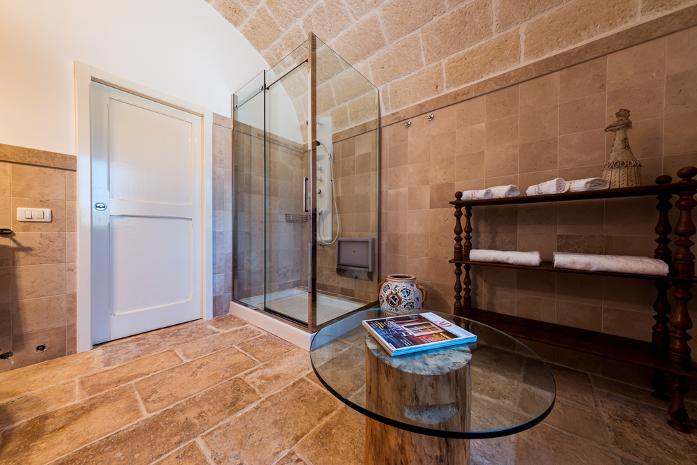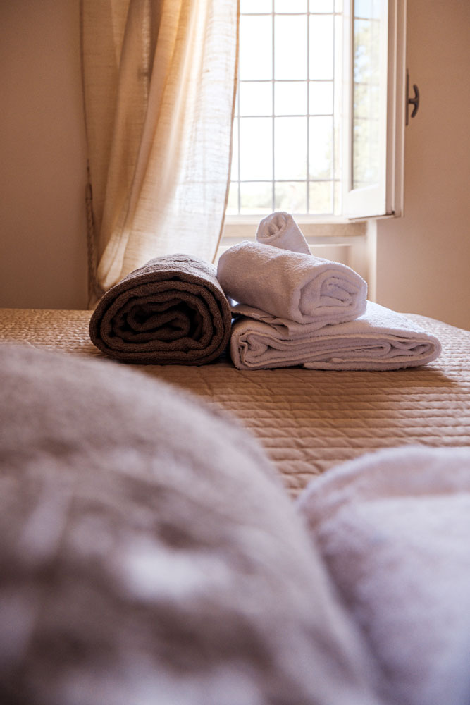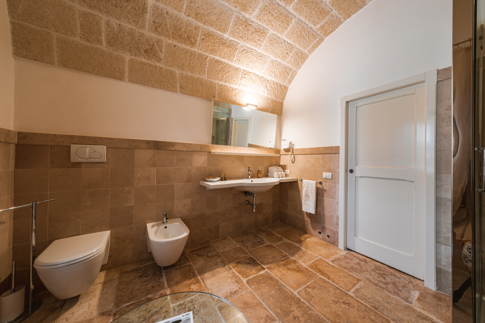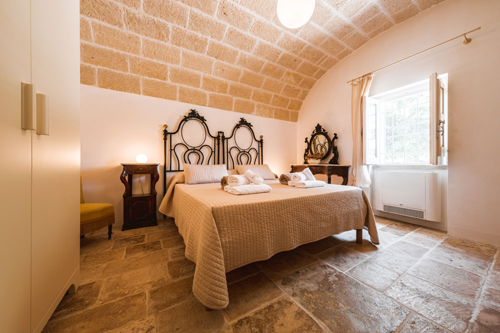 Gli ambienti, arredati nel puro stile della masseria pugliese, utilizzano materiali naturali, tonalità morbide e dettagli artigianali che raccontano la tradizione locale, creando un’atmosfera calda, accogliente e autentica. Le due stanze condividono un ampio bagno comune, luminoso e funzionale, progettato per garantire praticità e benessere durante tutto il soggiorno.