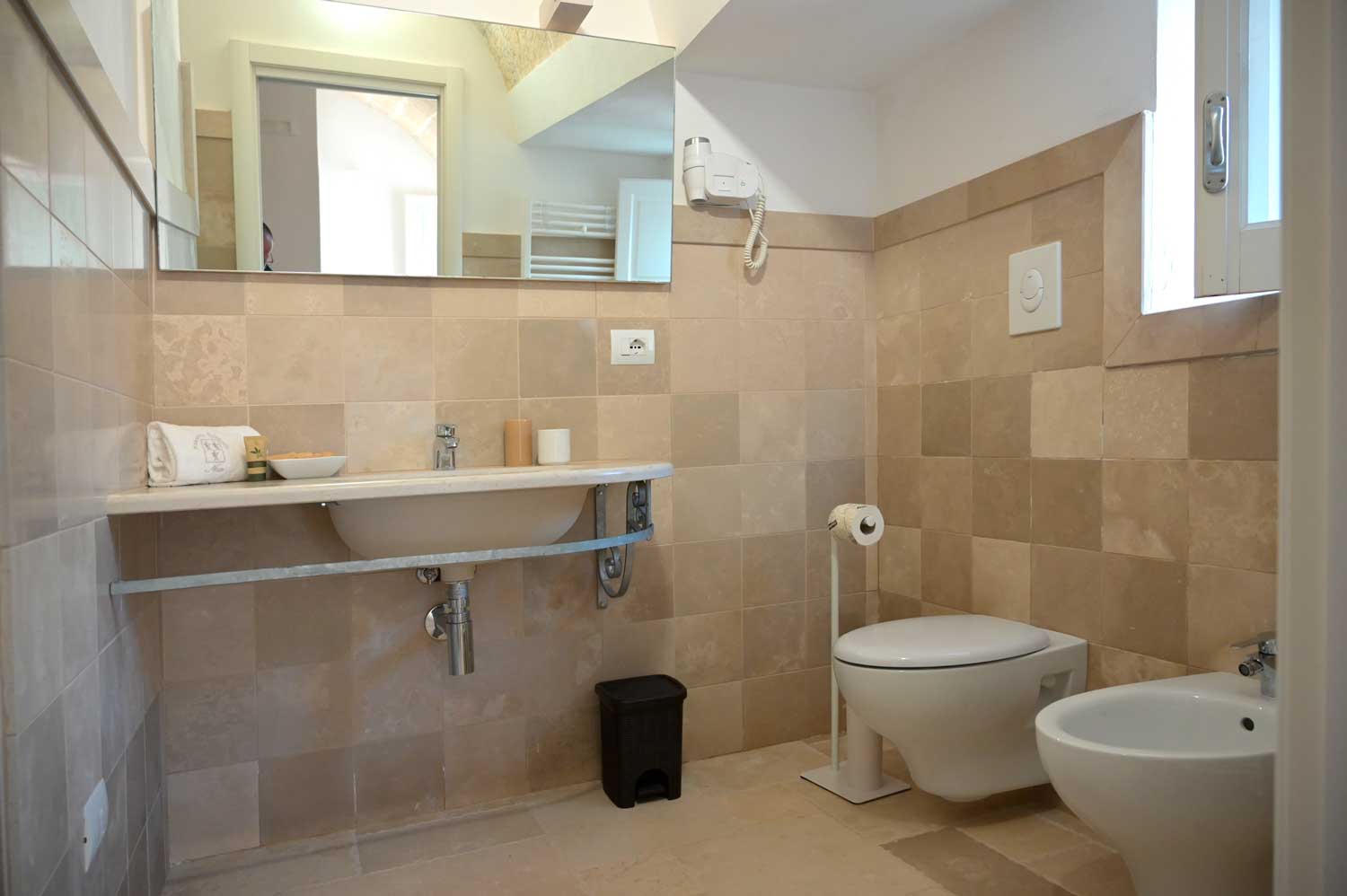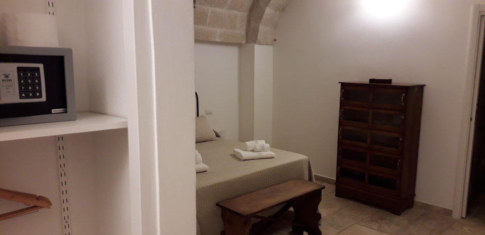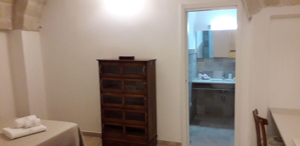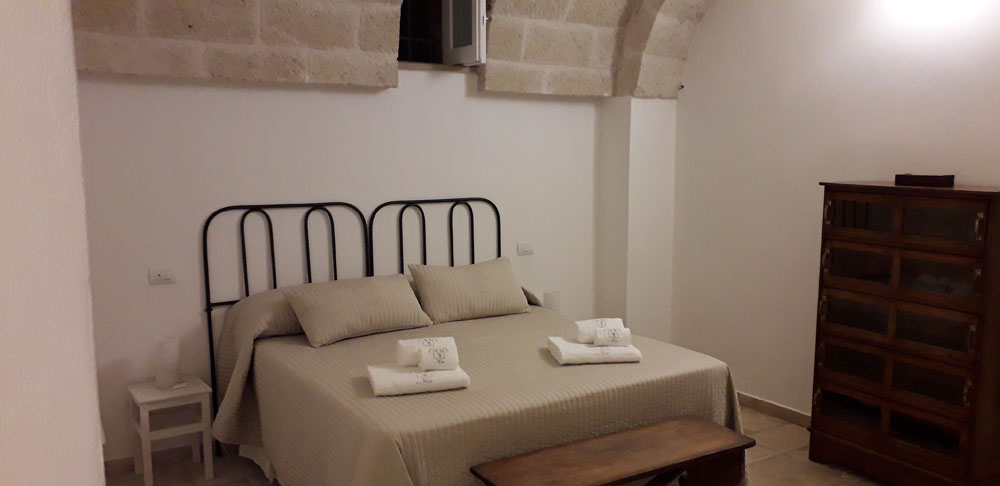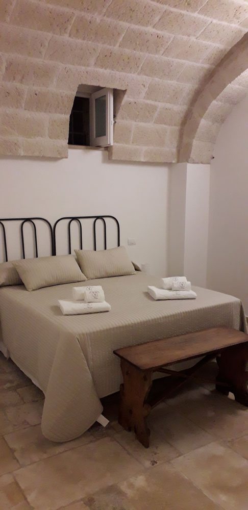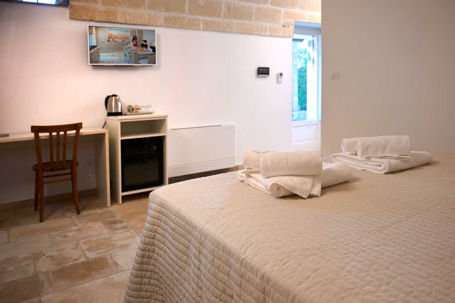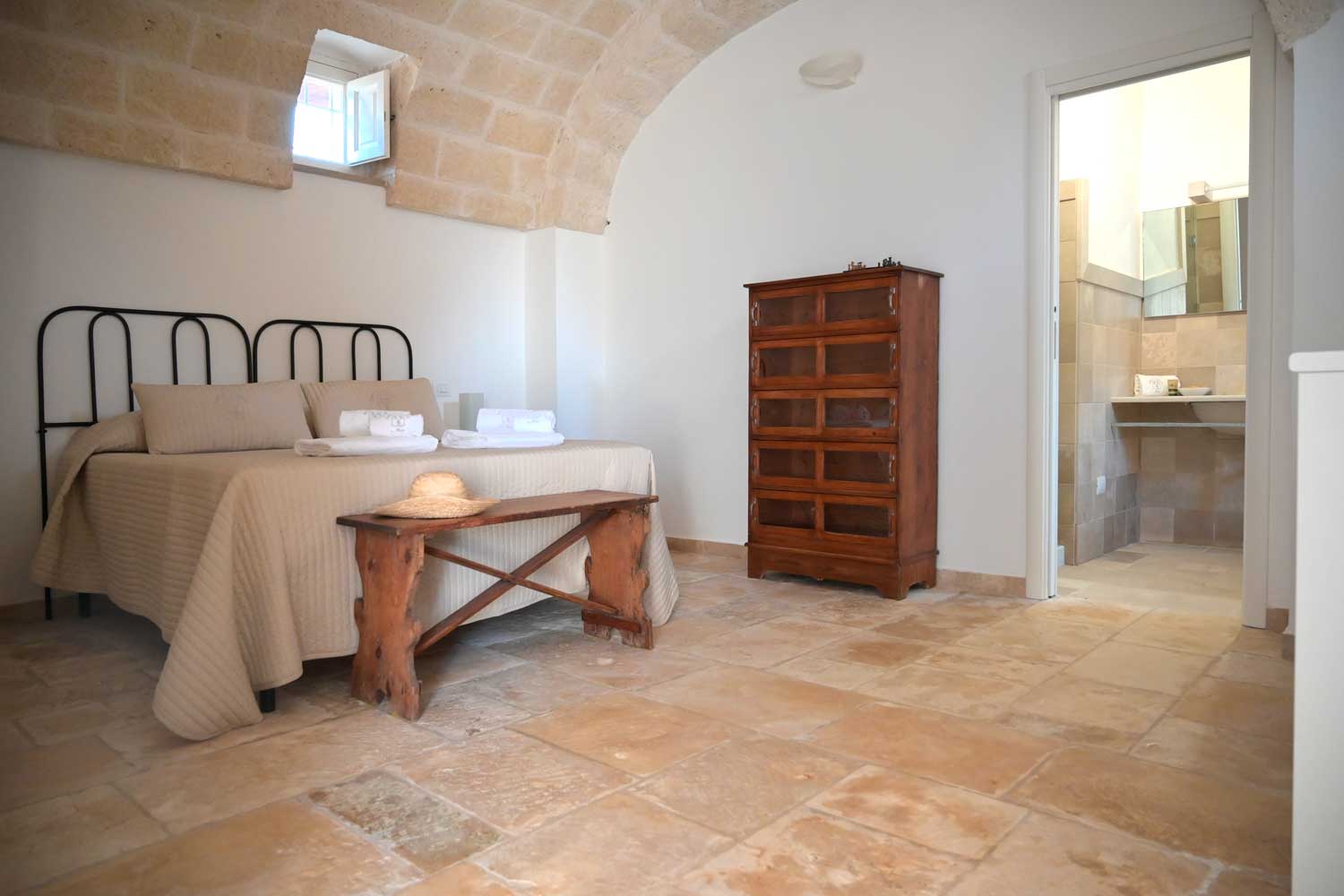 L’ambiente, arredato in stile masseria con linee essenziali e materiali naturali, ospita un comodo letto matrimoniale e uno scrittoio funzionale, ideale per leggere, scrivere o lavorare in totale serenità. Il bagno privato, completo di doccia, asciugamani, set di cortesia e accessori selezionati, garantisce praticità e benessere. Uno spazio intimo e curato, immerso nel silenzio e nei ritmi lenti della campagna pugliese.