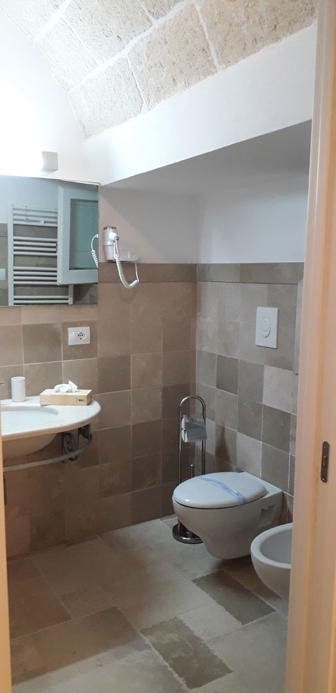 Il bagno privato è progettato per offrire un ambiente confortevole e funzionale, curato in ogni dettaglio. Dotato di una spaziosa doccia, dispone di morbidi asciugamani, set di cortesia con prodotti selezionati e tutti gli accessori indispensabili, come asciugacapelli, specchio e dispenser. Luminoso e pulito, si integra perfettamente con lo stile sobrio ed elegante della masseria, creando uno spazio ideale per rigenerarsi dopo una giornata trascorsa all’aria aperta.